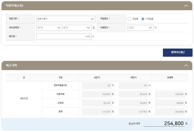 위택스/이택스에 차량 정보를 넣으면 바로 예상 세액이 나옵니다.