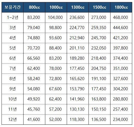 - 1,000cc 이하: cc당 80원