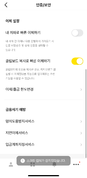 카카오뱅크 앱을 켜고, 명의도용방지 서비스를 설정했습니다.